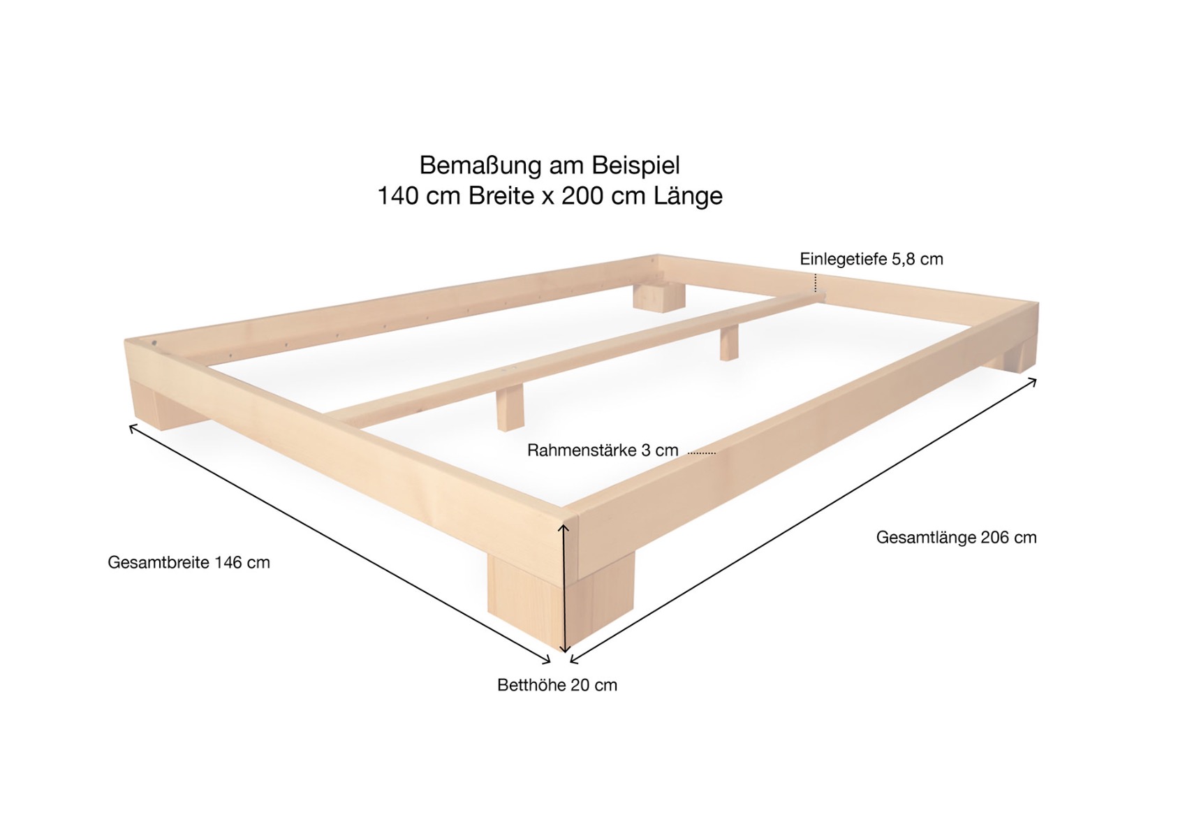 Eye-catching are the extra-wide cubic feet (15x15 cm) at a height of only 10 cm. Thus, Cube offers the typical futon lying comfort close to the floor. A timeless solid wood bed in rock-solid quality, excellently crafted and attractively priced. Can be combined with slatted frames up to approx. 4 cm total height.