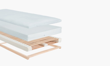 The slats on the upper side pass the load on to the natural latex buffers, which carry in a highly elastic way. Depending on the weight and support, this interaction creates a slightly floating feeling when lying down. Excess load is then transferred to the central buffer or the second row of slats. In this way, movements are absorbed in four stages and you are gently carried through the night. Suitable for every type of sleeper and every type of mattress.