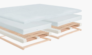 Ergovlex L is a latex sprung slatted frame. Its 2x 37 slats are made of beech plywood with a natural surface. The slats of the upper row are specially slit and rest on buffers made of natural latex and latexed coconut fibres. This creates an excellent contour fit.